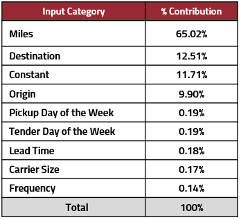 In Figure 3, we see a general breakdown of freight costs. The constant rates, such as mileage, destination, etc. will stay the same, and make up most of the overall price. Moving down the chart, all other variables such as pickup day of the week, tender day of the week, and lead time make up less than 1% of the costs on a typical load. In some extreme cases, those variables can contribute to over 20% of the total cost. So, how exactly does that happen?