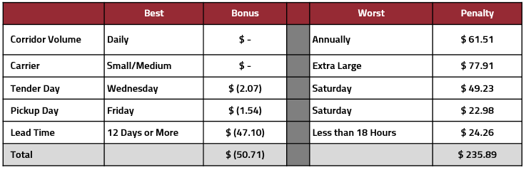 In Figure 6 above, you will notice a breakdown of the best and worst tender practice and rate factors. When combining the most ideal factors, like a Wednesday tender date and a 12 or more-day lead time, this results in an approximate savings of $50 on the average load. For the worst factors, like a Saturday tender and less than a day lead time, the average penalty cost reaches to nearly $250.