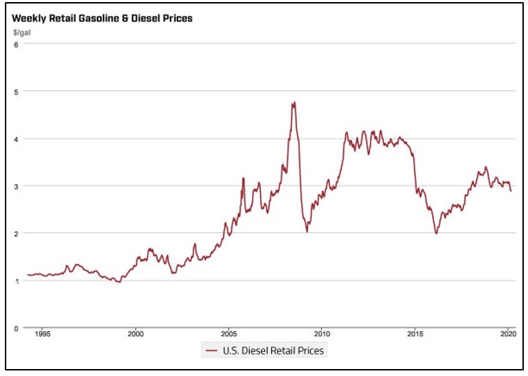 Fuel costs rank consistently as one of the largest cost centers for carriers on an annual basis, accounting for approximately 30-40% of a carrier’s CPM. Private fleets have recently reported that per-mile fuel costs have increased by more than 8% from 37 cents to 43 cents over the year, however, this remains well below the peak fuels costs of 2008 after the Great Recession.