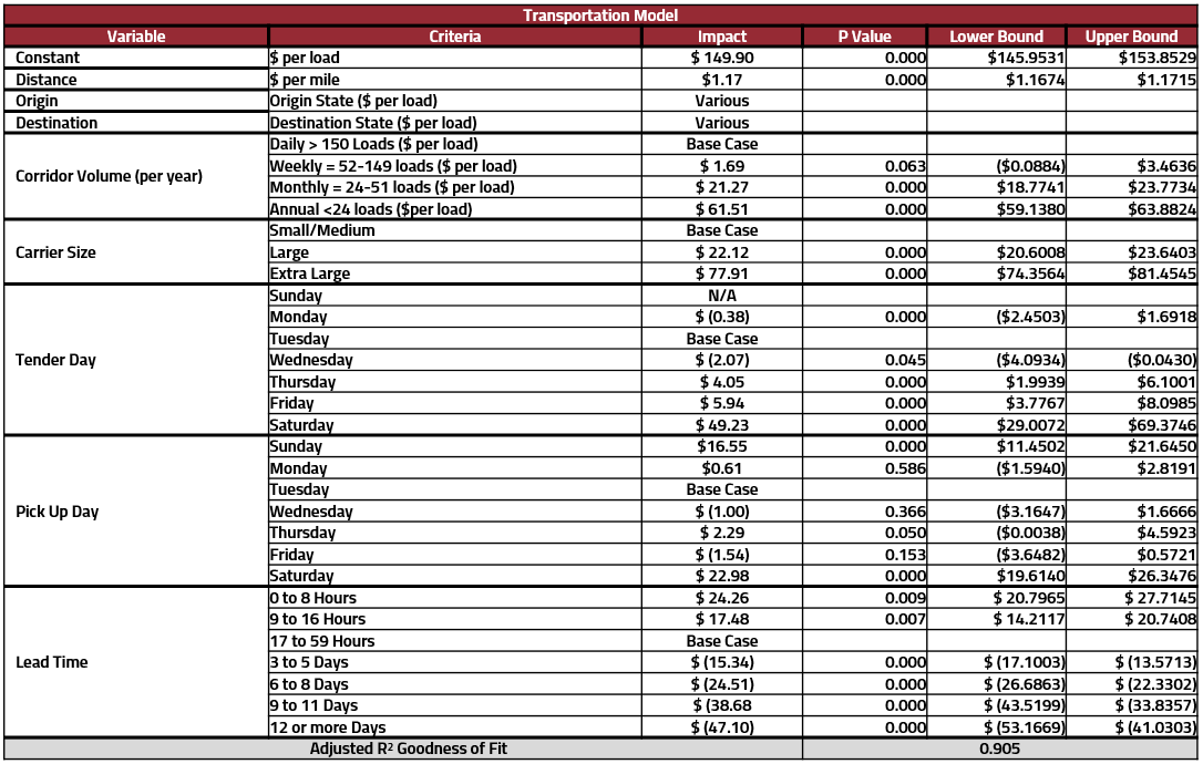 In Figure 3, we see a general breakdown of freight costs. The constant rates, such as mileage, destination, etc. will stay the same, and make up most of the overall price. Moving down the chart, all other variables such as pickup day of the week, tender day of the week, and lead time make up less than 1% of the costs on a typical load. In some extreme cases, those variables can contribute to over 20% of the total cost. So, how exactly does that happen?